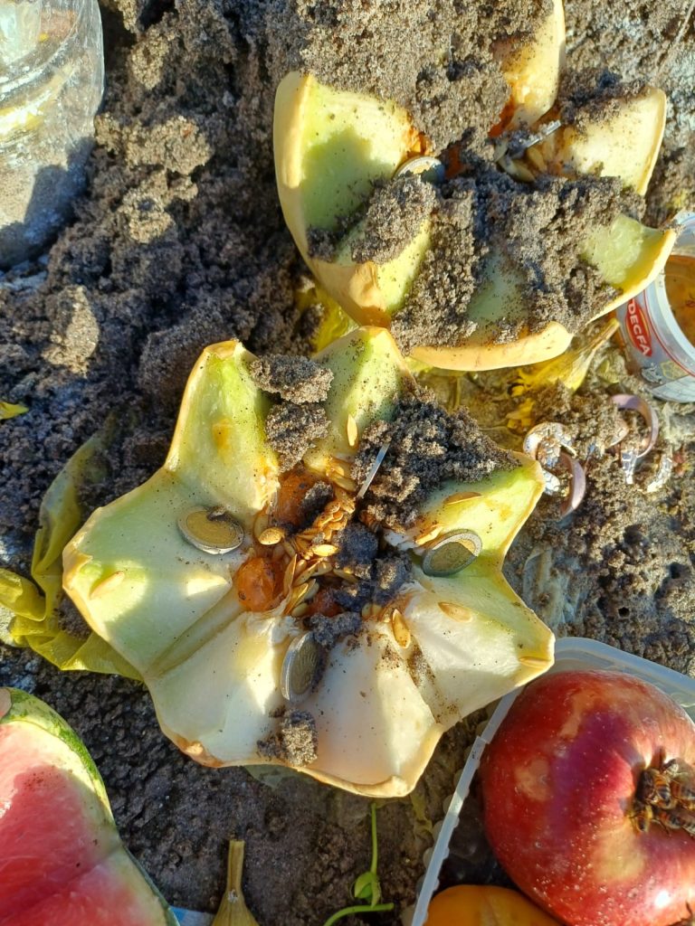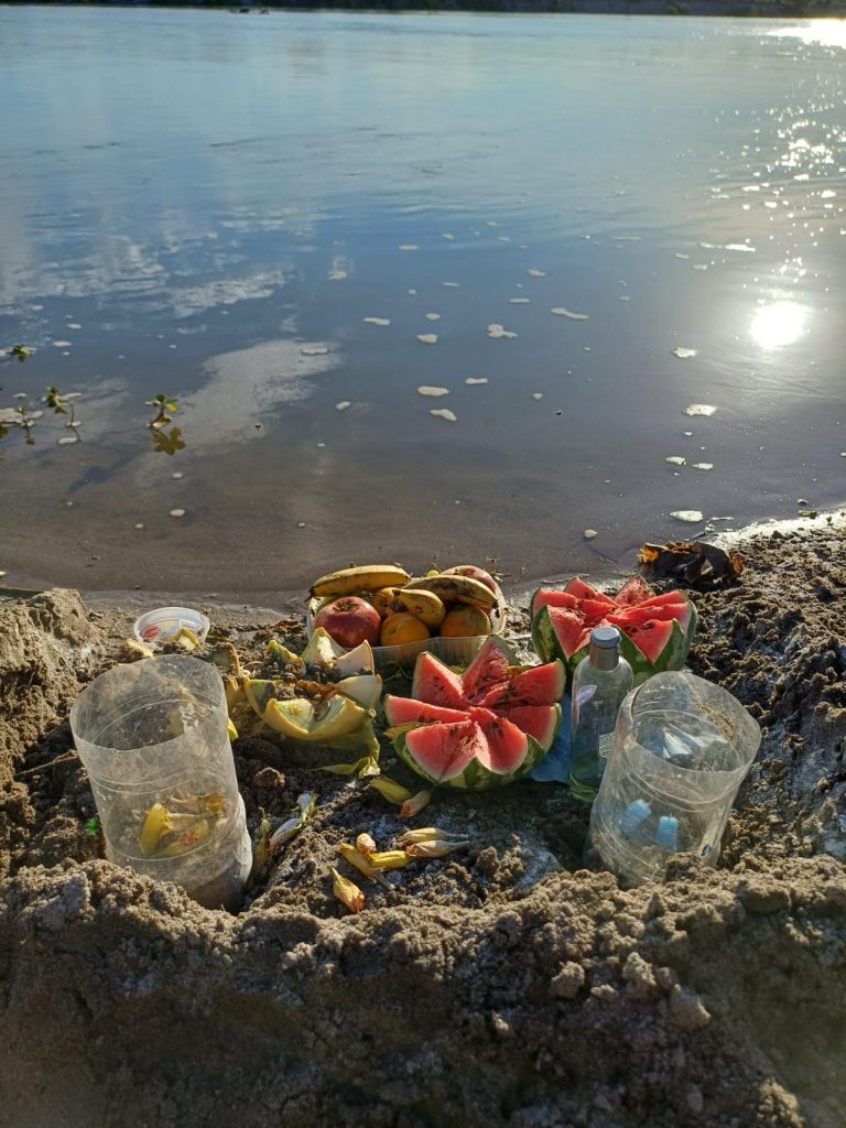 En medio de la arena se podía divisar numerosas frutas cortadas de manera muy singular, junto a un puñado de flores y una botella de bebida alcohólica. Sandías, melones, uvas, bananas, manzanas, miel, monedas, velas celestes y amarillas, eran otros e los objetos que formaban parte de los restos de un ritual, quizás.