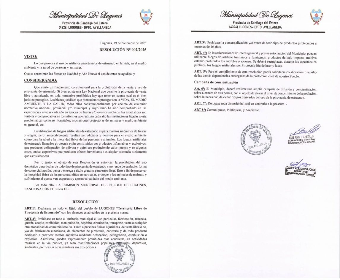 En la previa a los festejos de la Navidad y el Año Nuevo, el comisionado municipal de Lugones (Departamento Herrera) se declaró “libre de pirotecnia de estruendo”. A través de la Resolución N° 002/2025 prohíbe el uso, comercialización, venta o entrega gratuita de este tipo de elementos.