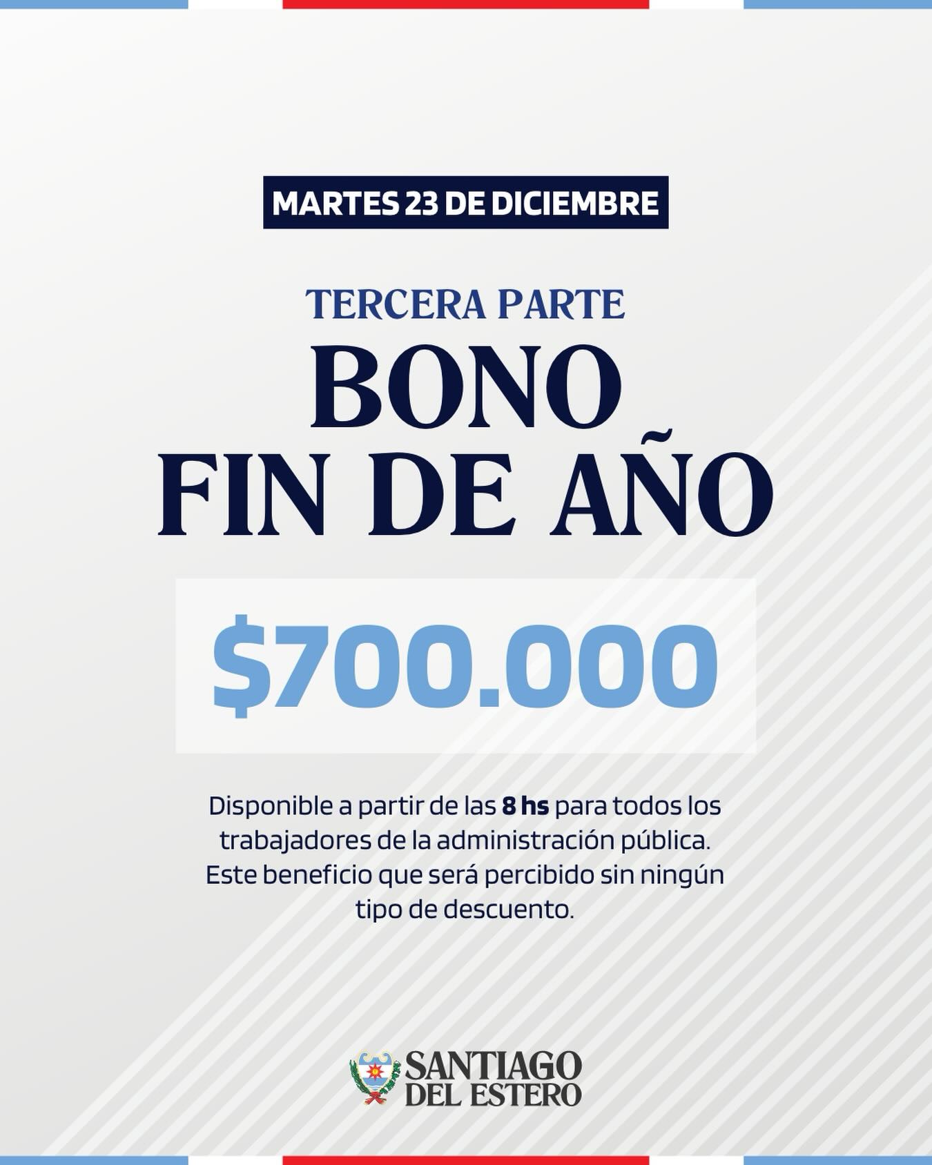 El Ministerio de Economía reiteró que mañana, martes 23 de diciembre, a partir de las 8 hs, estará disponible la tercera cuota del Bono de Fin de Año, otorgado por el Gobierno de la provincia para todos los trabajadores de la administración pública, beneficio que será percibido sin ningún tipo de descuento.
