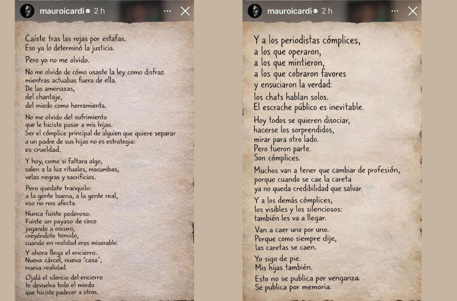 “Caíste tras las rejas por estafas… No me olvido del sufrimiento que le hiciste pasar a mis hijas”, escribió el delantero, quien también mencionó versiones sobre “rituales, macumbas y velas negras” vinculadas al abogado. Además, cargó contra la prensa, asegurando que el “escrache público es inevitable” para los periodistas que operaron en su contra durante el 2025, año en el que afirmó haber estado incomunicado con sus hijas.