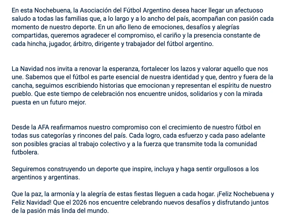 Finalmente, el mensaje cerró con un deseo de paz, armonía y alegría para estas fiestas, y con la expectativa de que el 2026 encuentre a la familia del fútbol argentino celebrando nuevos retos, siempre unida por una pasión que atraviesa generaciones.