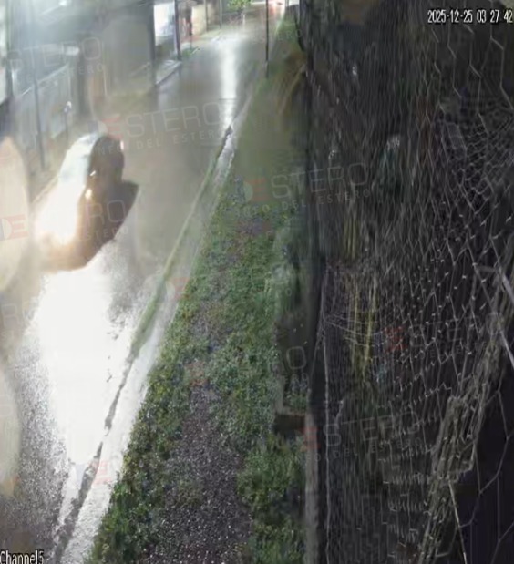 El registro al que pudo acceder Info del Estero pertenece a las cámaras de seguridad de un bar ubicado en esa intersección, y captó la secuencia a las 3:27 de la madrugada de este jueves 25 de diciembre, mientras una fuerte tormenta azotaba la ciudad.