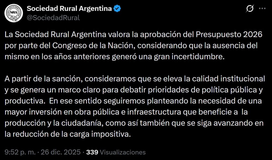 Tras la votación en la Cámara Alta, la Sociedad Rural Argentina (SRA) expresó su satisfacción por la aprobación del plan de gastos nacional para el próximo año. A través de sus canales oficiales, la entidad ruralista destacó que la sanción de esta ley representa un avance fundamental para el país, especialmente tras periodos previos marcados por la falta de un presupuesto formal. Para la SRA, contar con esta herramienta legislativa eleva la calidad institucional y pone fin a una etapa de incertidumbre que afectaba la planificación de los sectores productivos.