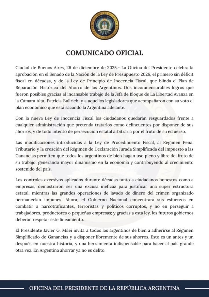 El Gobierno nacional celebró la aprobación en el Senado de la Nación de la Ley de Presupuesto 2026, que se convirtió en el primero sin déficit fiscal en décadas, junto con la sanción de la Ley de Principio de Inocencia Fiscal, una iniciativa que busca proteger el ahorro de los argentinos y brindar mayores garantías a los contribuyentes.