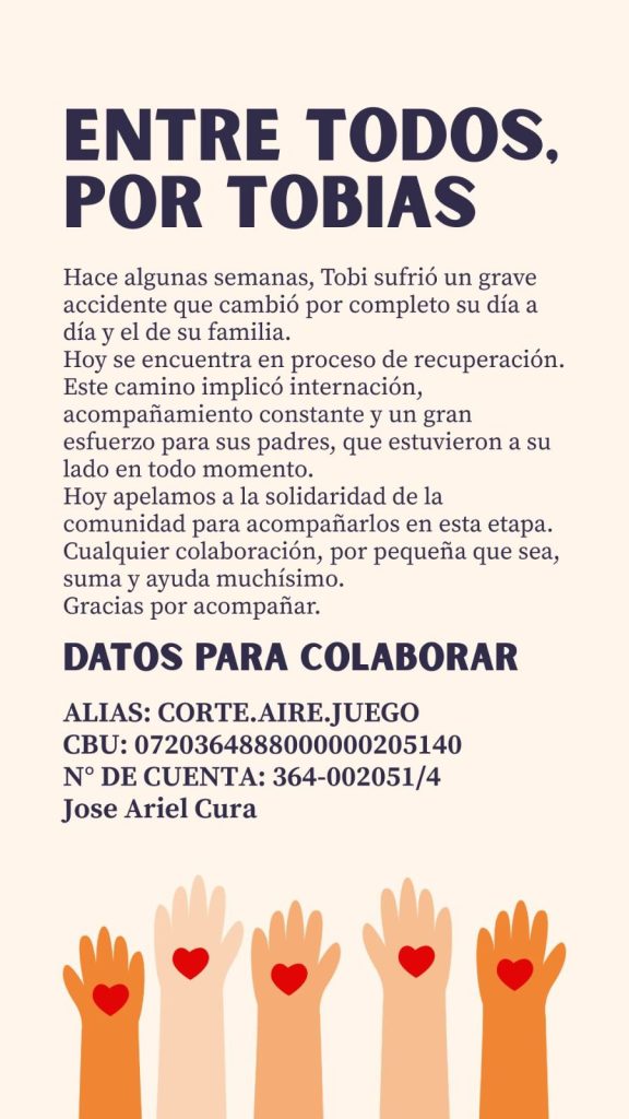 Según indicaron “cualquier colaboración, por pequeña que sea, suma y ayuda muchísimo” en los gastos periódicos. Los datos de la cuenta a nombre del papá de “Tobi”, José Ariel Cura, son los siguientes: Alias: CORTE.AIRE.JUEGO, N° de cuenta: 364-002051/4.