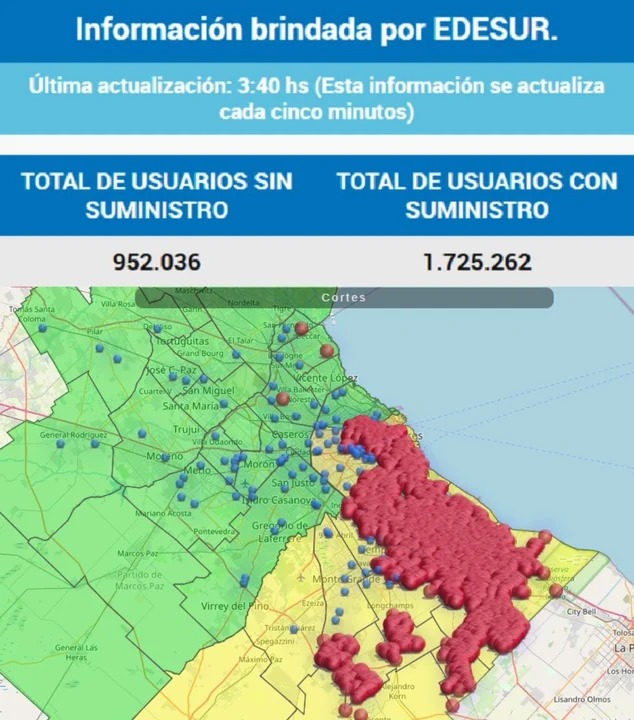 Se informó además que, cerca de la 01.30 se registró el récord de cortes sin luz con casi un millón de usuarios afectados