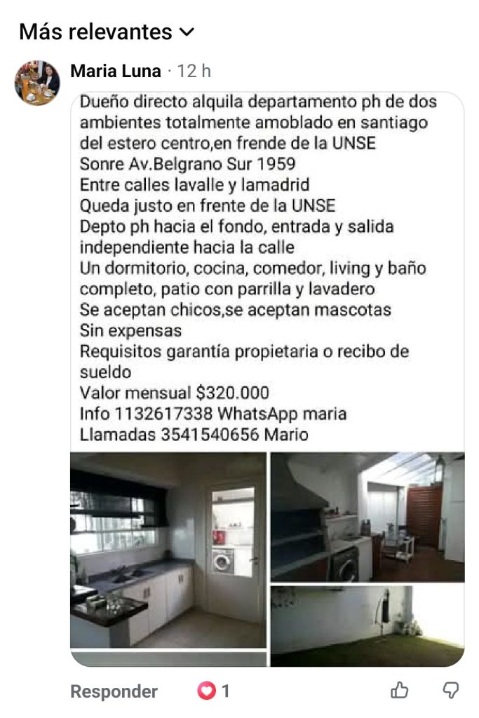 “Me comunique con el señor que aparece en el anuncio (Mario) y mensajes por WhatsApp con la señora (María) para arreglar el tema para firmar el contrato ya que soy de Quimilí y hasta el momento no tengo ninguna respuesta de ninguna de las 2 personas”, explicó el hombre y alertó a otros a que “tengan cuidado”, ya que siguen ofreciendo el departamento en cuestión.