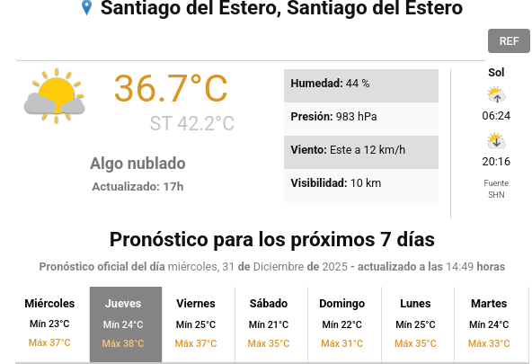 Santiago del Estero despide el 2025 con un día “de fuego”: a las 17, el termómetro marcó 36.7° de temperatura, pero la sensación térmica alcanzó 42.2°.