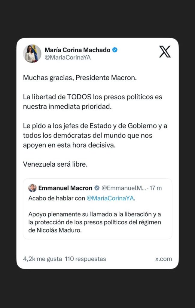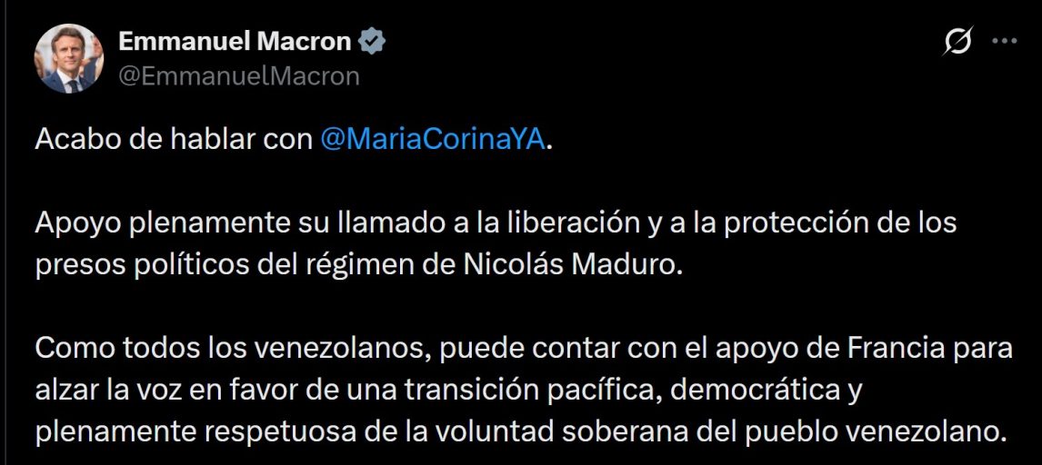 A través de sus canales oficiales, Macron reveló haber mantenido una conversación directa con la líder opositora María Corina Machado. Durante este contacto, el jefe de Estado francés manifestó su rotundo respaldo a la causa democrática: “Apoyo plenamente su llamado a la liberación y a la protección de los presos políticos del régimen de Nicolás Maduro”.