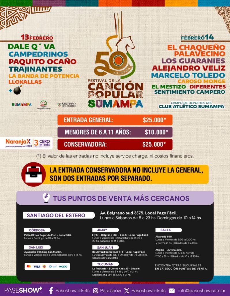 Pero eso no es todo, en esa misma fecha se presentará Dale Q’ Va, Campedrinos, Paquito Ocaño, Trajinantes, La Banda de Potencia y Llokallas. Mientras que el sábado de febrero, la cartelera será encabezada por el Chaqueño Palavecino. También subirán a escena Los Guaraníes, Alejandro Véliz, Marcelo Toledo, Cardoso Monge, el Mestizo, Diferentes y Sentimiento Campero.