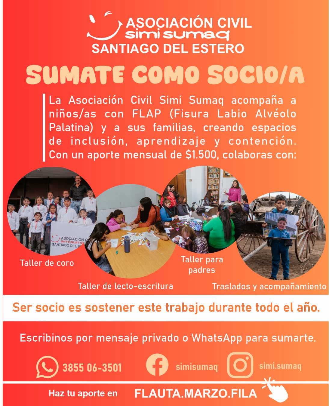 La Asociación Civil Simi Sumaq Santiago del Estero lanzó una convocatoria abierta para sumar nuevos socios y socias que permitan fortalecer el trabajo que realizan con niñas y niños con FLAP (Fisura Labio Alvéolo Palatina) y sus familias.