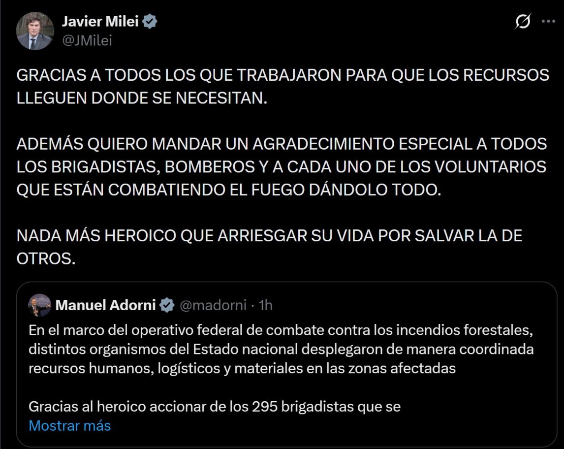 A través de su cuenta en la plataforma X, el mandatario nacional envió un mensaje directo a quienes trabajan en las áreas más comprometidas de Chubut, donde las llamas han afectado cerca de 12.000 hectáreas: “Quiero mandar un agradecimiento especial a todos los brigadistas, bomberos y a cada uno de los voluntarios que están dándolo todo. Nada más heroico que arriesgar su vida por salvar la de otros”, expresó Milei, agradeciendo también la gestión para que los recursos lleguen a destino.