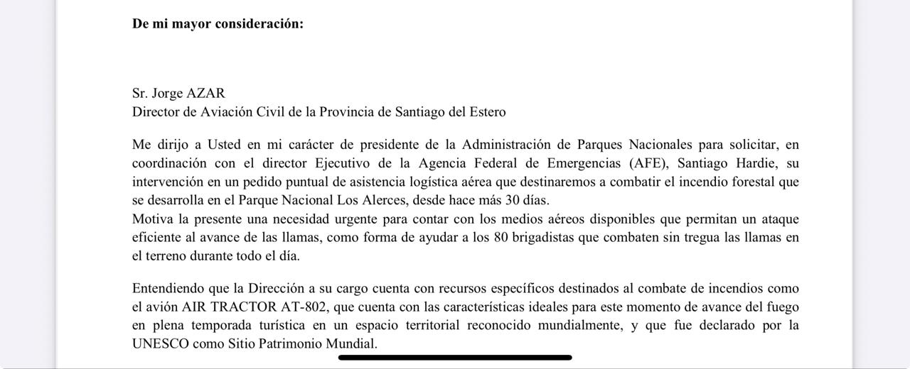 En otro de los párrafos de este pedido del estado nacional al gobierno de la provincia, especifican en el envío del avión AIR TRACTOR-802, indicándole al Director de Aviación Civil de la Provincia que: “entendiendo que la Dirección a su cargo cuenta con recursos específicos destinados al combate de incendios como el avión AIR TRACTOR-802, que cuenta con LAS CARACTERÍSTICAS IDEALES PARA ESTE MOMENTO DE AVANCE DEL FUEGO en plena temporada turística en un espacio territorial reconocido mundialmente, y que fue declarado por la UNESCO como Sitio Patrimonio Mundial”.