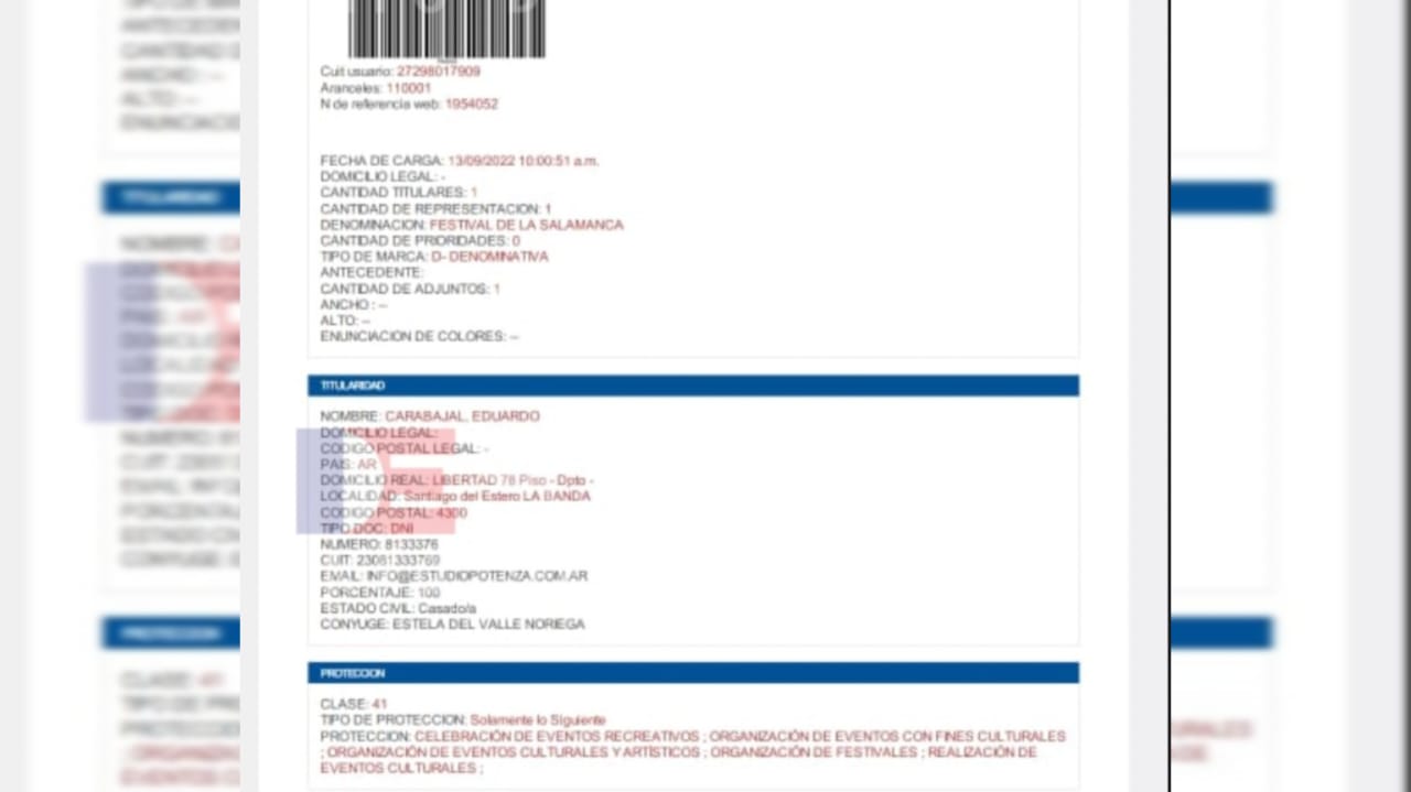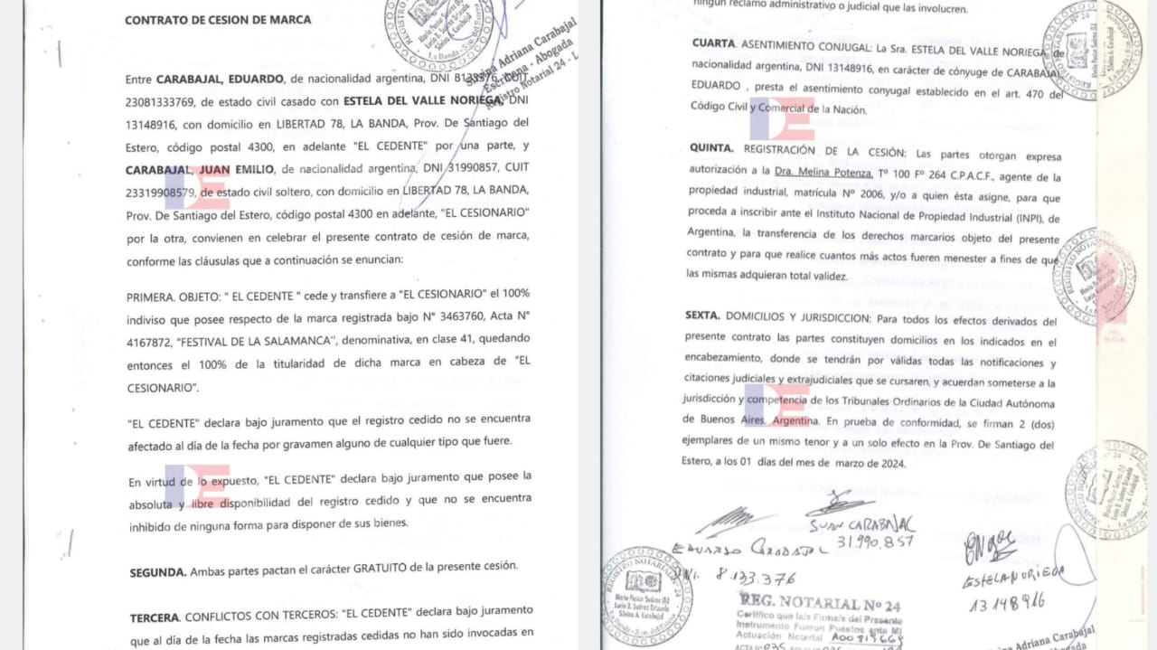 Info del Estero accedió de manera exclusiva a una serie de documentos que prueban como en el año 2023 el INPI (Instituto Nacional de Propiedad Intelectual) dispuso que la marca “Festival de La Salamanca” pase a manos de una rama de la familia Carabajal, en este caso de Eduardo “Chaca” Carabajal, fallecido a mediados del año pasado, y que fuera el creador, allá por 1992 de este popular festival folclórico.