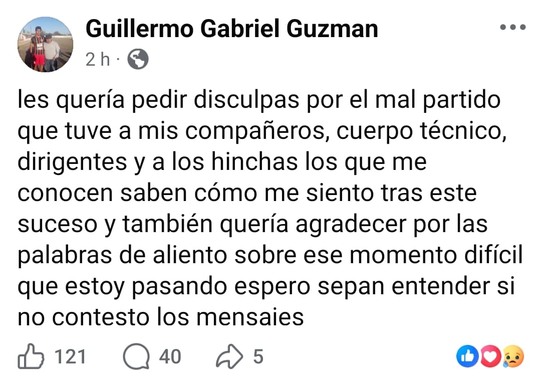 “Les quería pedir disculpas por el mal partido a mis compañeros, cuerpo técnico, dirigentes y a los hinchas. Los que me conocen sabe como siento tras este suceso. También quería agradecer por las palabras de aliento en este momento difícil que estoy pasando. Espero sepan entender si contesto los mensajes”, destacó Guzmán.