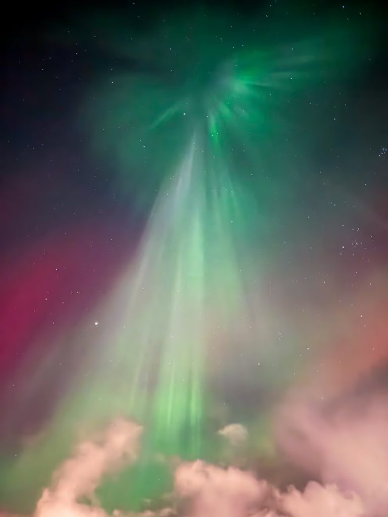 Las auroras se intensificaron y aparecieron en latitudes inusuales cuando partículas solares interactuaron con gases de la atmósfera terrestre (@jakesonaplane_)