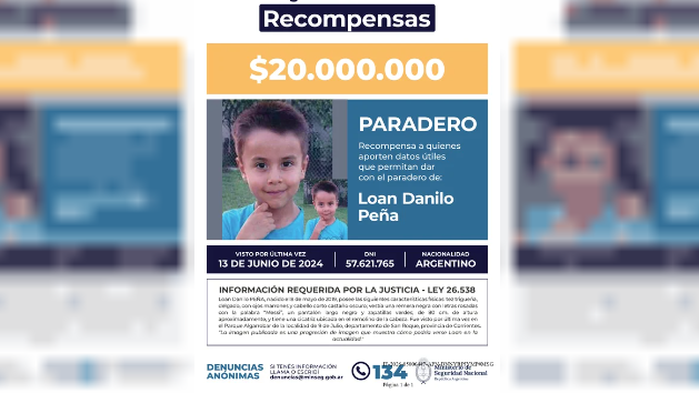 El Gobierno Nacional, a través del Ministerio de Seguridad Nacional, confirmó que se aumentaron las recompensas por las desapariciones de los pequeños Loan Peña y Lian Flores. El primero fue visto por última vez a mediados de junio de 2024 en Corrientes y el otro chico desde fines de febrero de 2025 en Córdoba.