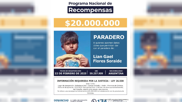 En esta ocasión, el Gobierno Nacional y el Ministerio impusieron al comienzo de la pesquisa una recompensa de $10 millones para quién aporte datos fehacientes de Lian, quién desapareció el 22 de febrero de 2025, en Ballesteros Sud, provincia de Córdoba, al momento de la siesta.