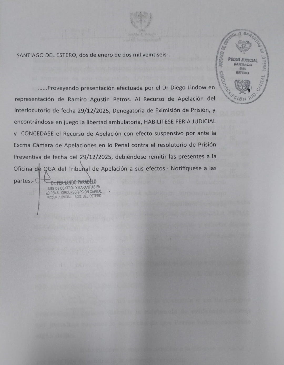 “Luego de eso no tuve más comunicación con mi cliente”, señaló Lindow, quien indicó que se encuentra aguardando información oficial para conocer con precisión la situación procesal de Petros. En ese sentido, remarcó que, de confirmarse la detención, sería ilegal, ya que la orden había quedado suspendida en virtud de la apelación concedida.