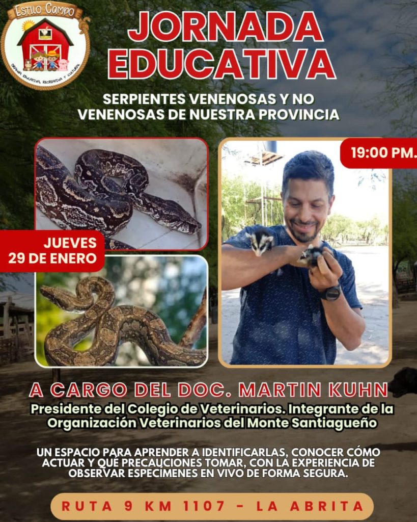 La actividad estará a cargo del doctor Martín Kuhn, presidente del Colegio de Veterinarios e integrante de la Organización Veterinarios del Monte Santiagueño, quien brindará una exposición pensada para aprender a identificarlas, conocer cómo actuar ante un encuentro y qué precauciones tomar, con la posibilidad de observar ejemplares en vivo de manera segura.