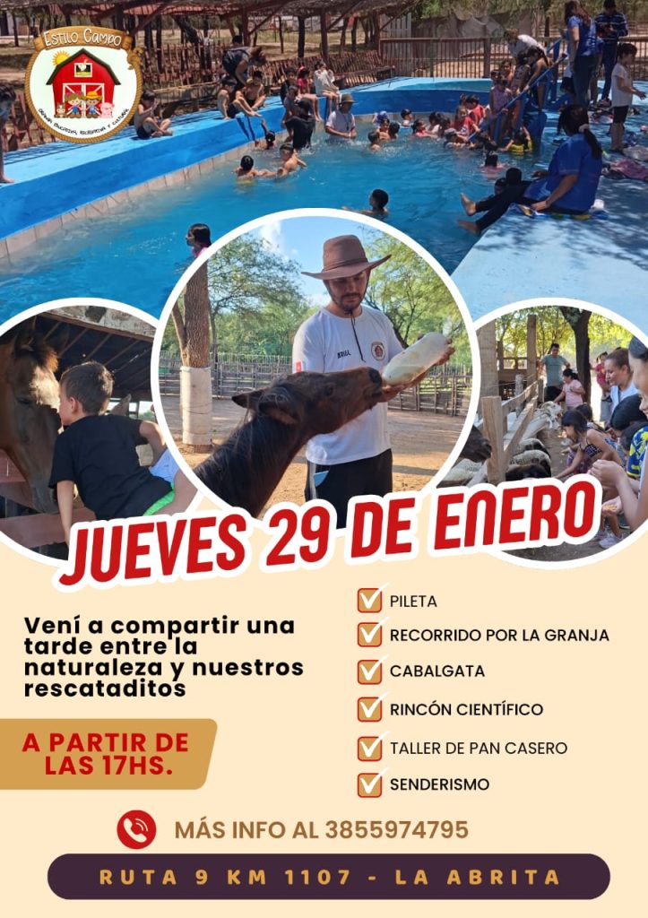 Desde Estilo Campo invitan a la comunidad a compartir una tarde diferente en contacto con la naturaleza, combinando recreación, aprendizaje y educación ambiental, en un espacio que promueve el respeto por los animales y el entorno. Para más información: 385 597 4795.