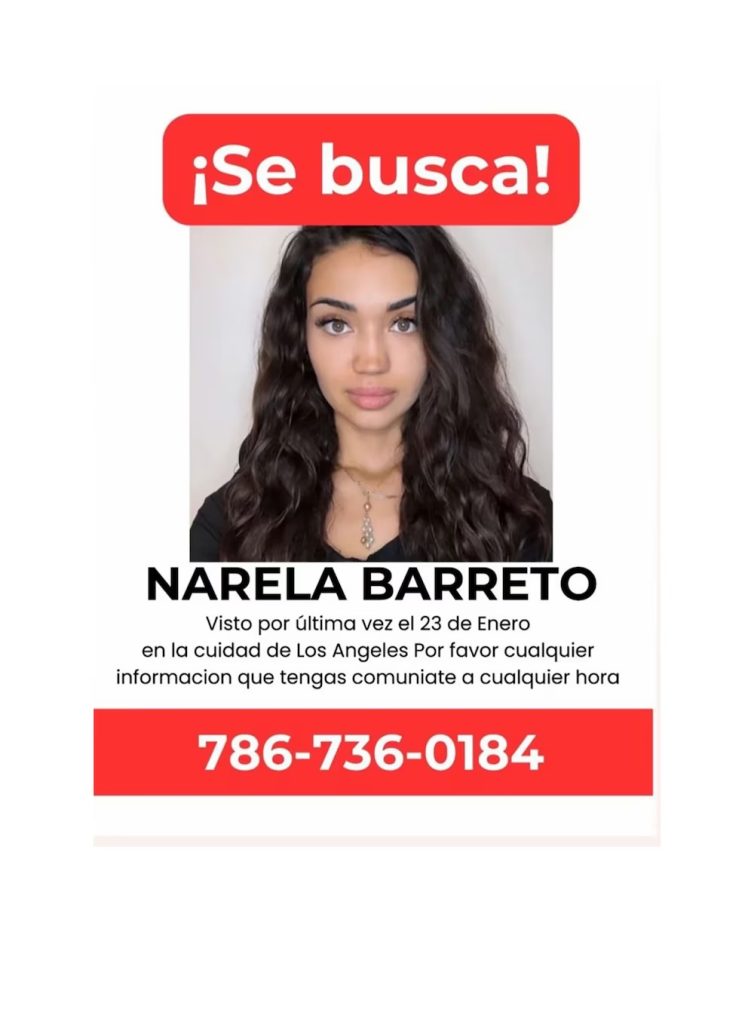Para viralizar la búsqueda, sus amigos y familiares habían creado un afiche para redes sociales que decía: “¡Se busca! Narela Barreto. Vista por última vez el 23 de enero en la ciudad de Los Ángeles. Por favor, cualquier información que tengas, comunicate a cualquier hora al 786-736-0184”.
