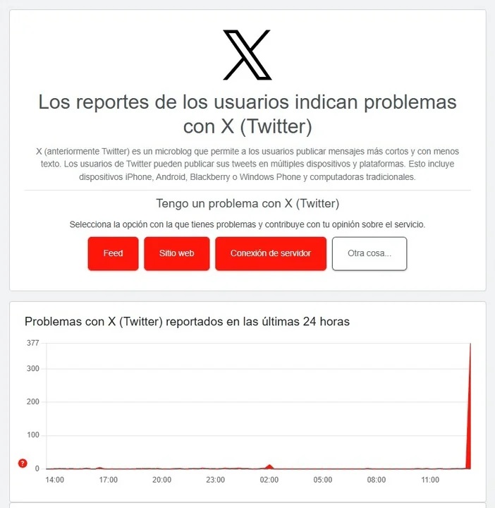 Los reportes se dispararon rápidamente y quedaron reflejados en los sistemas de monitoreo en tiempo real. Las estadísticas de Downdetector muestran con claridad la magnitud del inconveniente: luego de una jornada estable, con reportes prácticamente nulos, la curva de incidencias registró un pico vertical repentino, superando las 377 notificaciones en un corto lapso de tiempo.