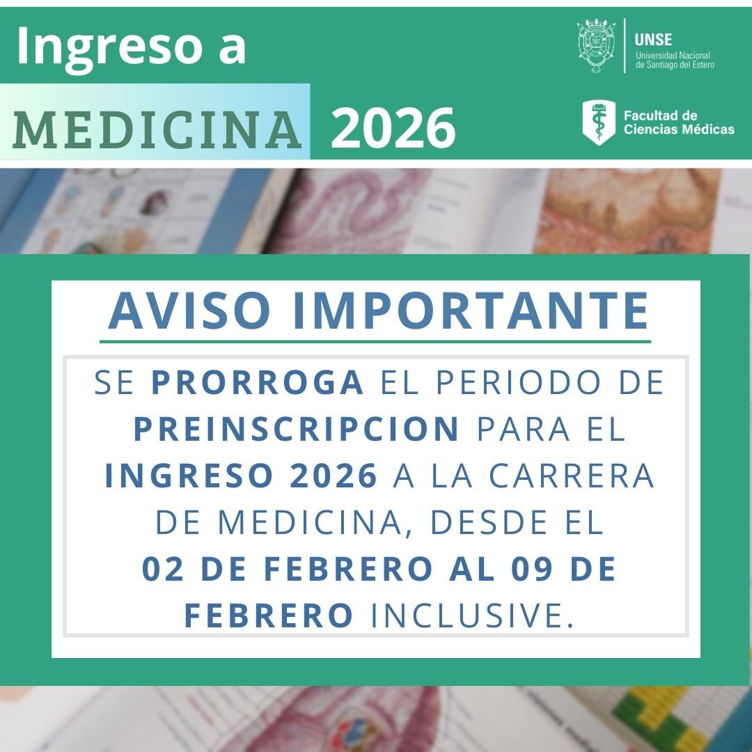 La Facultad de Ciencias Médicas de la UNSE prorrogó el período de preinscripción para el Ingreso 2026 a la carrera de Medicina. La nueva etapa de preinscripción se extenderá desde el lunes 2 al lunes 9 de febrero inclusive, hasta las 12 horas como fecha límite para la recepción del formulario en el Departamento de Alumnos.