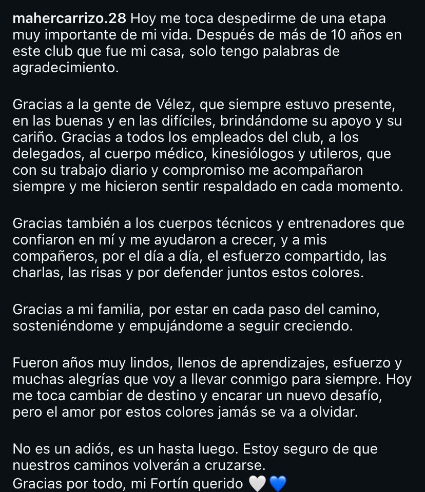 A través de sus redes sociales, el jugador santiagueño publicó un mensaje profundamente emotivo para despedirse de Vélez, institución a la que llegó hace más de una década y que considera su casa.