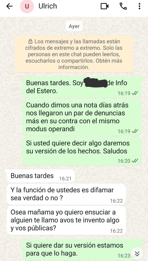 Info del Estero se había comunicado ayer con Ezequiel Ulrich para que dé su testimonio, antes de entregarse y quedar hoy detenido, y su respuesta fue: “¿y la función de ustedes es difamar sea verdad o no? O sea mañana yo quiero ensuciar a alguien te llamo a vos, te invento algo y vos publicás? No me manejo así yo. Tratá de publicar cosas no reales para evitar confusiones”. Hemos intentado nuevamente comunicarnos con él, pero entendemos que su teléfono está en manos de la justicia.