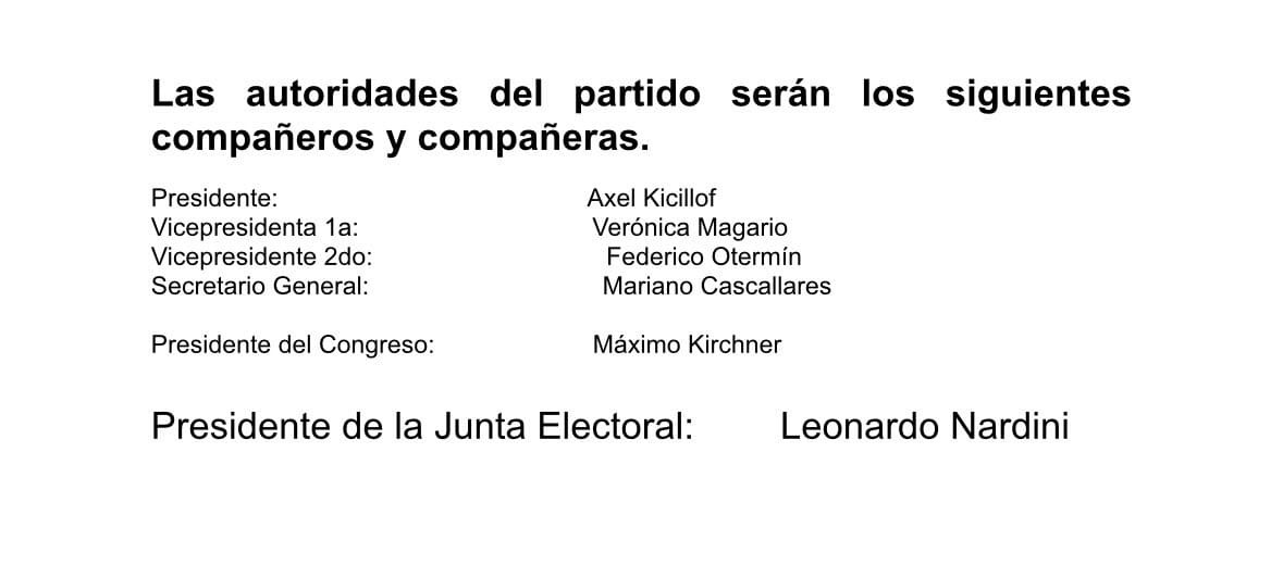 La nueva conducción quedará conformada por Axel Kicillof como presidente, Verónica Magario como vicepresidenta primera, Federico Otermín como vicepresidente segundo, Mariano Cascallares como secretario general, Máximo Kirchner como presidente del Congreso partidario y Leonardo Nardini como titular de la Junta partidaria.