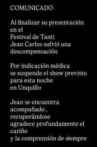 Ante la incertidumbre generada por su estado, el entorno íntimo de Jean Carlos emitió un comunicado oficial a través de sus redes sociales para llevar tranquilidad a sus seguidores. En el texto informaron que el cantante se encuentra acompañado por sus seres queridos y en proceso de recuperación. Como consecuencia directa de esta situación, los representantes confirmaron la suspensión del show que el artista tenía previsto realizar esa misma noche en la localidad de Unquillo, priorizando el cumplimiento de las estrictas indicaciones médicas para garantizar su estabilidad.