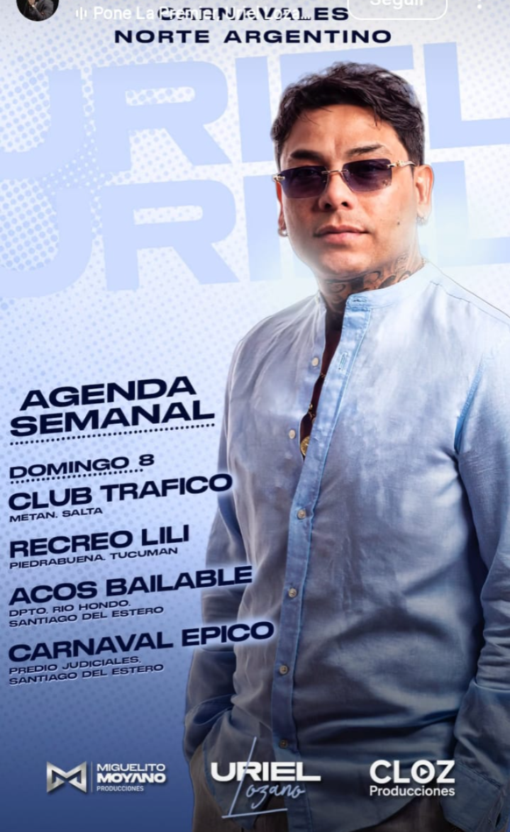 En las redes sociales santiagueñas no pasó inadvertida ayer la ausencia del cantante Uriel Lozano, quien estaba anunciado para un baile de carnaval que se llevó a cabo en el predio de un gremio estatal ubicado en el Parque Aguirre, y que en un video difundido por el mismo artista hace mención a su no presentación por “problemas técnicos” y que la misma se reprograma para más adelante, mientras que no son pocos quienes sostienen que el motivo fue otro.