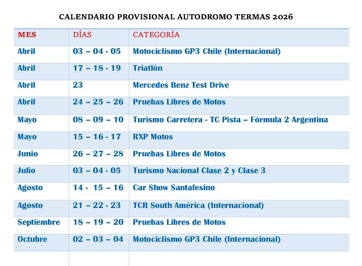 Se amplía el calendario 2026 del autódromo de Las Termas de Río hondo, están confirmados para la presente temporada doce fines de semana de actividad, como siempre con variedad de eventos deportivos.