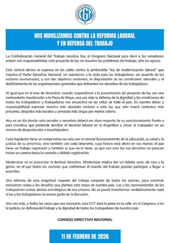 La Confederación General del Trabajo (CGT) difundió este miércoles un comunicado en el que ratificó su rechazo a la reforma laboral que se debate en el Senado, mientras comienzan a llegar los manifestantes a la movilización convocada frente al Congreso Nacional. Bajo la consigna “Modernizar no es precarizar ni destruir derechos”, la central sindical planteó que el proyecto impulsado por el Poder Ejecutivo agrava las condiciones laborales y debilita a las organizaciones gremiales.