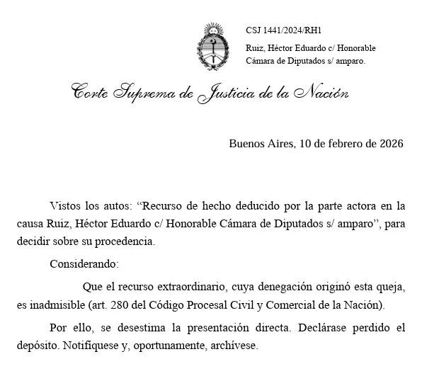 Mediante una resolución breve, el máximo tribunal rechazó la queja interpuesta por Ruiz al amparo del artículo 280 del Código Procesal Civil y Comercial de la Nación, norma que habilita a la Corte a desestimar recursos extraordinarios sin expresar fundamentos. En consecuencia, declaró perdido el depósito efectuado.