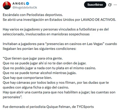 En ese contexto, Ángel de Brito aseguró que el periodista Quique Felman, de TyC Sports, habría sido demorado en el marco de esta investigación. Hasta el momento, no se difundieron detalles oficiales sobre su situación procesal ni imputaciones formales.