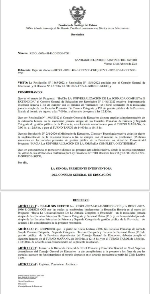 A través de una Resolución emitida por el Consejo General de Educación se oficializó el cese de la Hora Extendida en Santiago del Estero. La medida abarca a todas las modalidades del nivel primario.