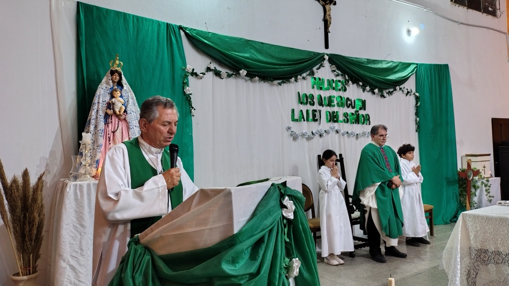 Desde el punto de encuentro, se inició una solemne procesión que recorrió la calle Dorrego hasta Libertad, culminando en la Parroquia Nuestra Señora del Rosario. El clima de oración preparó el corazón de los presentes para la Santa Misa, que fue presidida por el sacerdote local, Vicente Avellaneda.