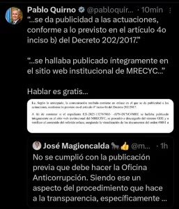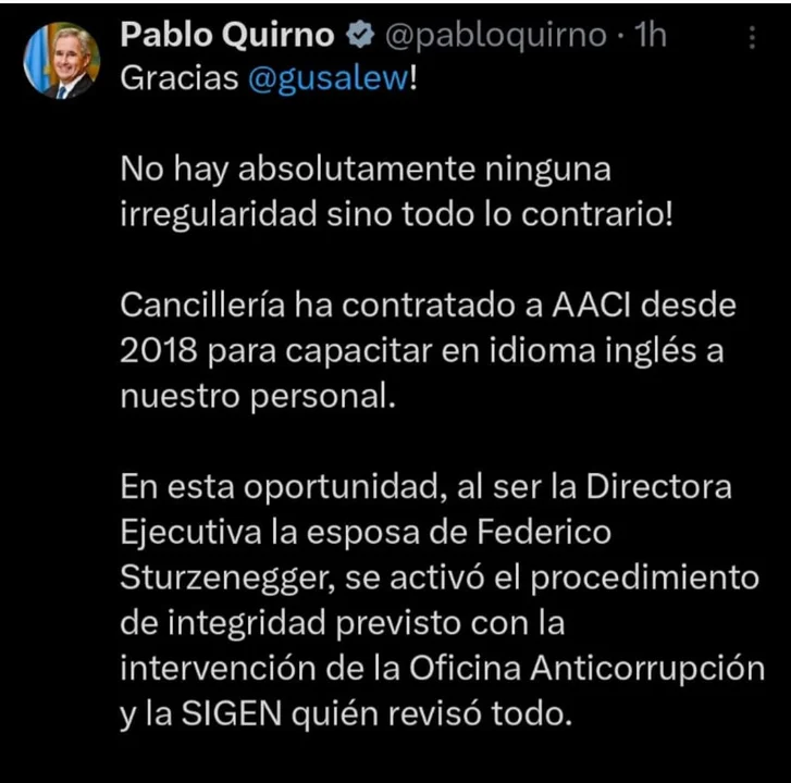 El canciller Pablo Quirno salió al cruce de los cuestionamientos afirmando que no existe “absolutamente ninguna irregularidad” en el vínculo con la AACI, entidad con la que el Ministerio de Relaciones Exteriores trabaja desde el año 2018. Según explicó el funcionario a través de sus redes sociales, al detectarse el lazo familiar entre Rouillet y Sturzenegger, se activó el protocolo de integridad previsto en el Decreto 202/2017. Este procedimiento incluyó la intervención de la Oficina Anticorrupción (OA) y la Sindicatura General de la Nación (SIGEN), cuyos informes fueron incorporados al expediente público para avalar la legalidad del trámite.