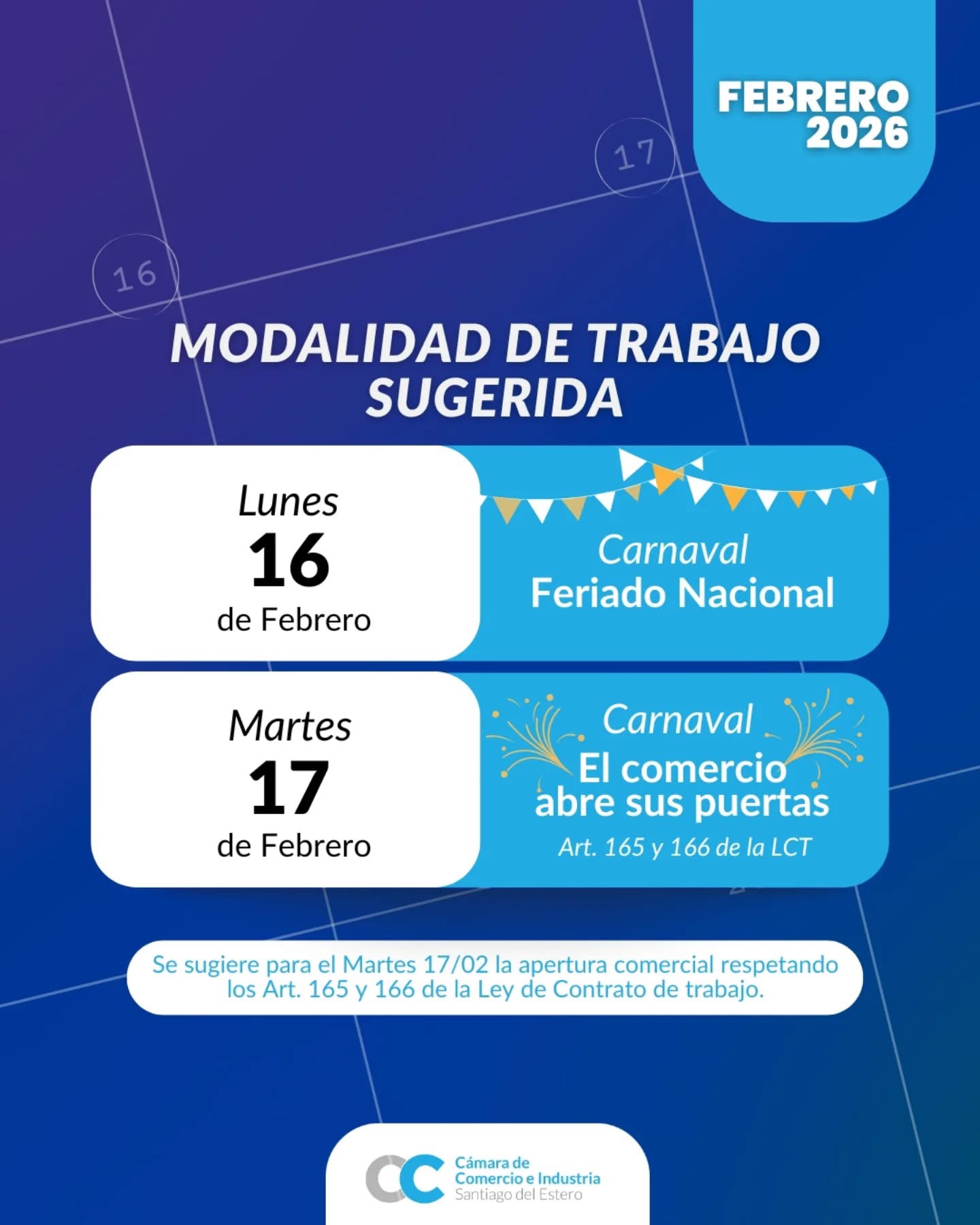 La Cámara de Comercio e Industria de Santiago del Estero difundió la modalidad de trabajo sugerida para los días lunes 16 y martes 17 de febrero, en el marco del feriado de Carnaval.