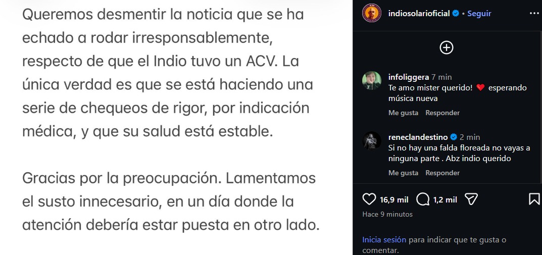 A través de un comunicado publicado en la cuenta oficial del artista, se informó: “Queremos desmentir la noticia que se ha echado a rodar irresponsablemente, respecto de que el Indio tuvo un ACV. La única verdad es que se está haciendo una serie de chequeos de rigor, por indicación médica, y que su salud está estable”.