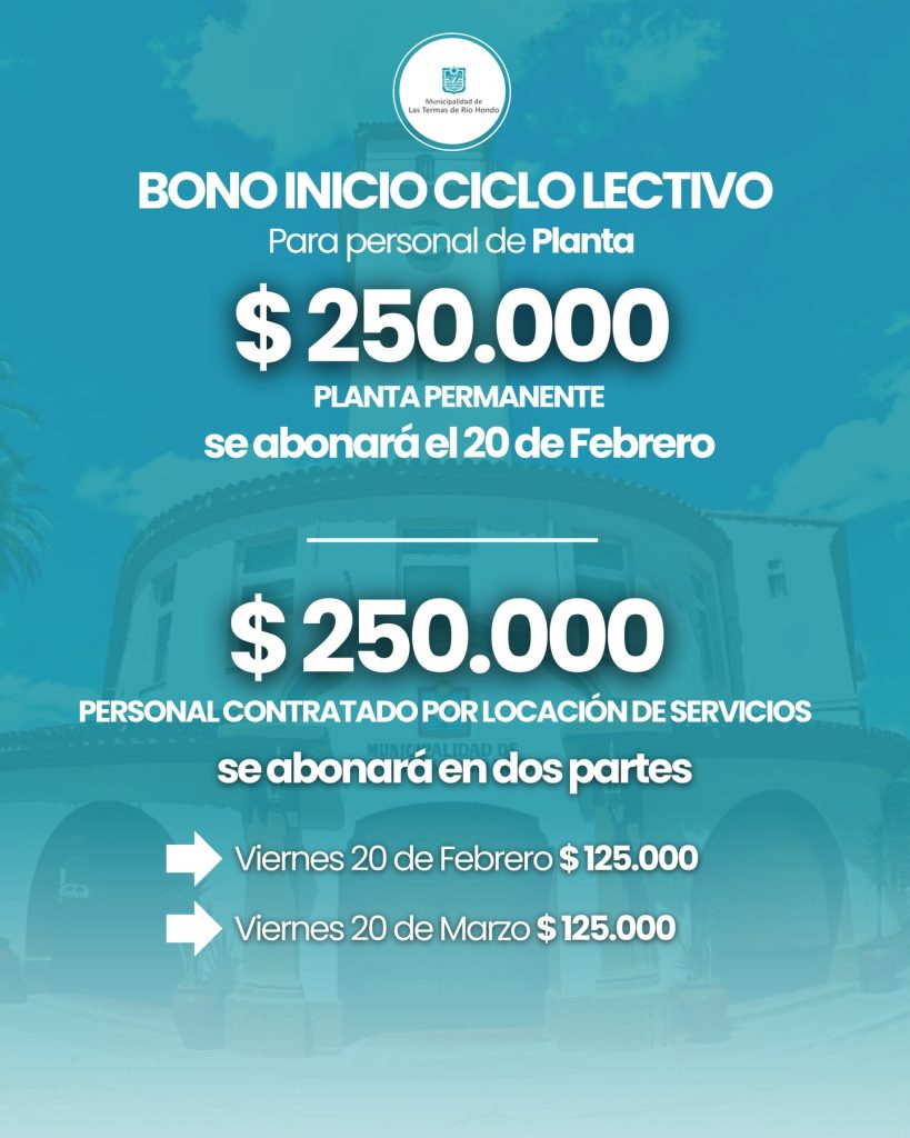 En adhesión a lo anunciado por el Gobernador de la Provincia Elías Suárez y por disposición de la intendente Dra. Paula Cánepa, anunció el pago de un “Bono inicio del ciclo lectivo” de $250.000. El beneficio está destinado al personal municipal de Planta Permanente y se hará efectivo mañana.