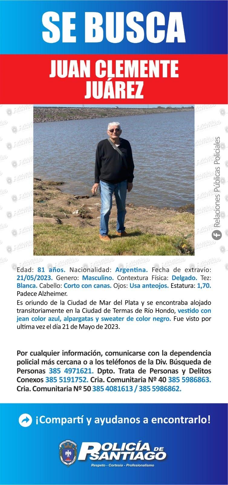 Un mensaje recibido en el WhatsApp de las Noticias de Info del Estero reaviva el pedido de búsqueda de Juan Clemente Juárez, un hombre de 81 años que se encuentra desaparecido desde el 21 de mayo de 2023 en la ciudad de Las Termas de Río Hondo.