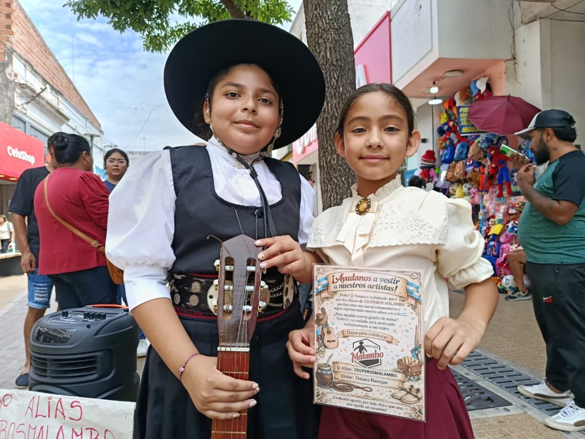 El ritmo del malambo irrumpe cada sábado por la mañana en las peatonales del centro capitalino. Entre el ir y venir de la gente, dos niños y una niña despliegan zapateos firmes, giros y figuras tradicionales mientras invitan a los transeúntes a colaborar con un sueño colectivo: renovar la indumentaria del grupo Troperos Malambo.