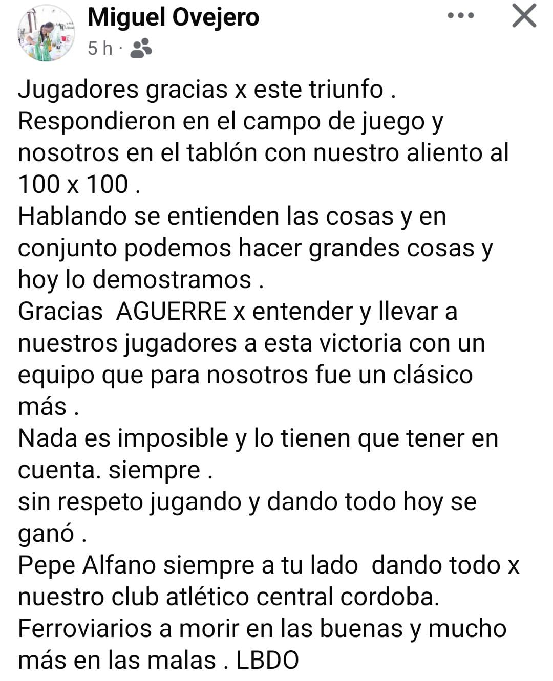 El jefe de la barra de Central Córdoba, denominada La Barra del Oeste (LBDO) dejó un mensaje anoche en su cuenta de Facebook donde le agradece a los jugadores por el primer triunfo “ferroviario” en el torneo por 2 a 0 ante Talleres de Córdoba.