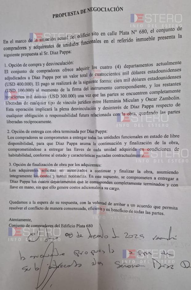 En diálogo con Info del Estero, el abogado José Julián, se refirió a este documento y confirmó su existencia al manifestar que “esa propuesta se hizo en el mes de agosto del año pasado y la hemos presentado conjuntamente con otros damnificados”. Sobre las propuestas, Julián indicó que allí “se han planteado las tres soluciones. Te pagamos el valor de la propiedad a un monto y está estipulado, ahí terminamos nosotros los departamentos ofrecidos por Zambolín o vos termina el edificio. Fueron tres soluciones razonables donde los estafados estábamos dispuestos a seguir poniendo plata para solucionar el conflicto”.
