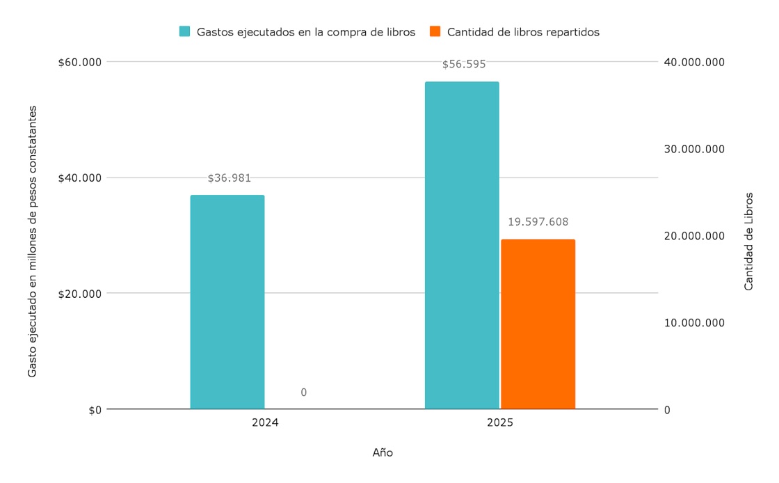 Gasto ejecutado en provisión de libros en millones de pesos de 2025 (izquierdo) y cantidad de libros (derecho) provistos para la alfabetización. Años 2024 y 2025.