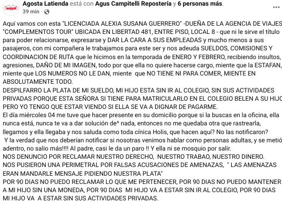 El posteo, publicado en Facebook por una mujer que asegura haber trabajado para la empresa, apunta directamente contra Alexia Susana Guerrero, a quien identifica como dueña de la agencia “Complementos Tour”, ubicada sobre calle Libertad al 400.