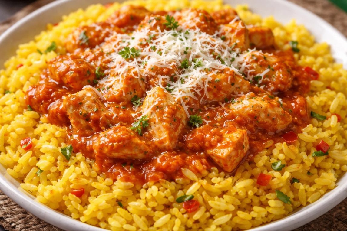 El pollo lo haces aparte, en una salsa como la del guiso: pollo y ajo a la cacerola con un poco de aceite, lo sellas, agregas verduras, puré de tomate, caldo y condimentos. Lo dejas cocinar tranquilo.